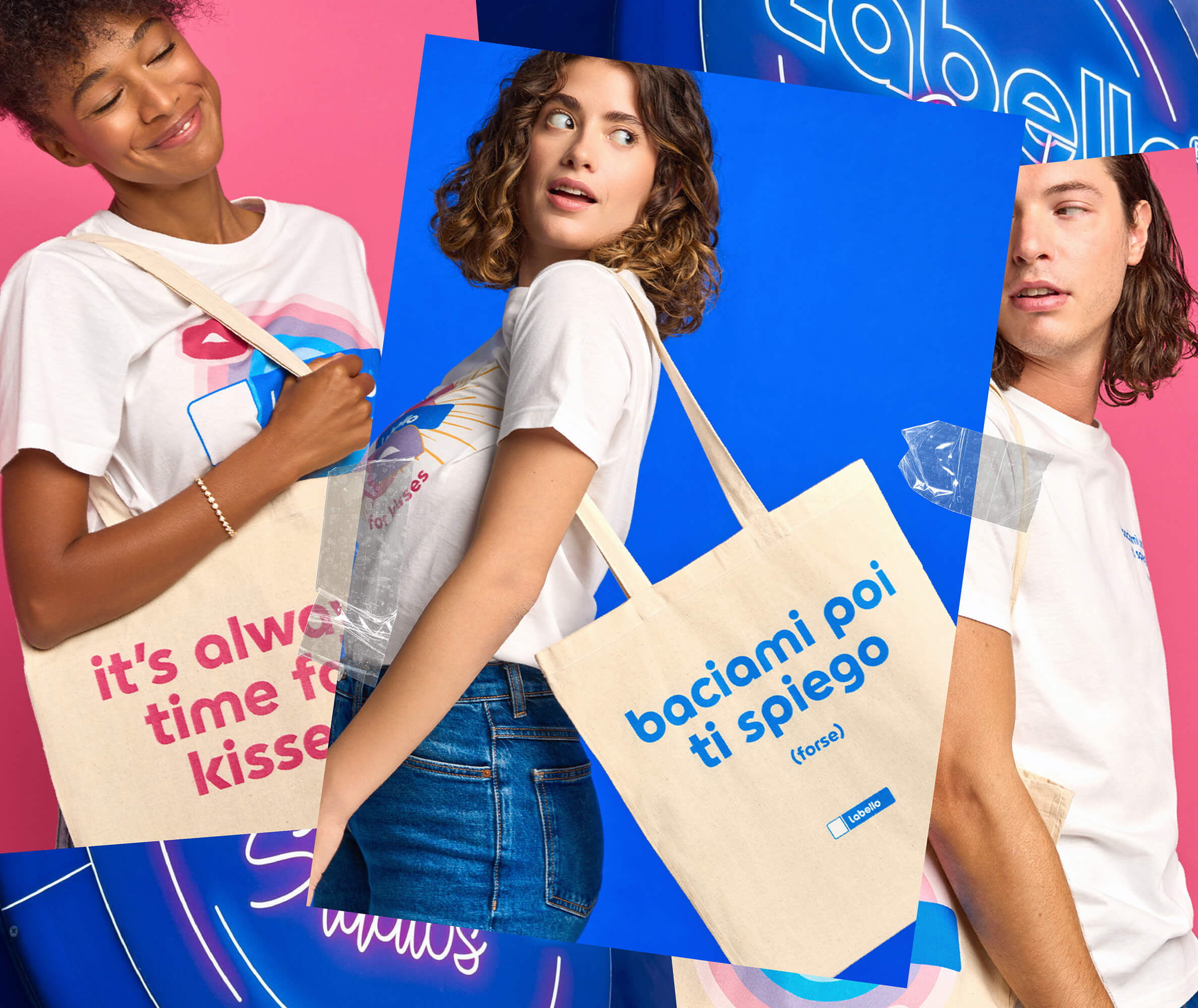 Limited-edition merch: tote bags, t-shirts, neon signs with signature taglines like “Kiss me, I’ll explain (maybe)” and “It’s always time for kisses”.